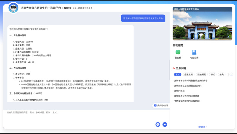 复试流程太复杂?科目信息找不到?专业方向难抉择?别担心,“智能机器人小E”来帮你!依托DeepSeek大模型的强大语义理解能力,我们的智能问答系统能快速读懂你的问题,提供准确的回复,让你的考研之路更顺畅!