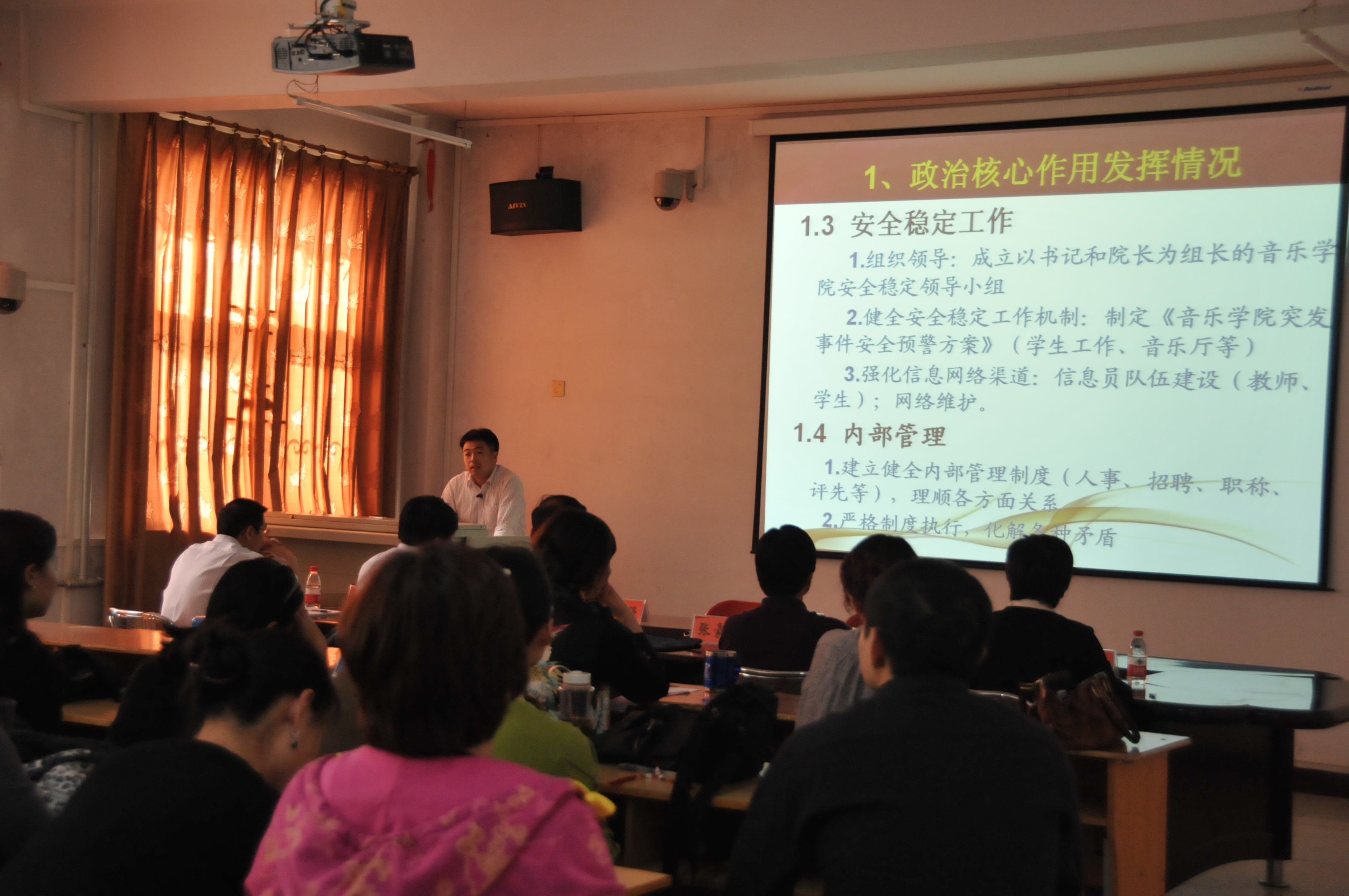 段续院长致欢迎词,他代表校学院师生向评估考察组的到来表示热烈欢迎和衷心感谢。他指出,近年来,音乐学院在校党政的正确领导下,在职能部门和兄弟院校的大力支持下,学院创造性实施“增辉与关怀”党建工程,制定并实施“差异化竞争”发展战略,取得了一系列喜人的成绩。这次评估专家组对我院进行党建工作评估,必将为我院科学发展注入新的动力和活力。