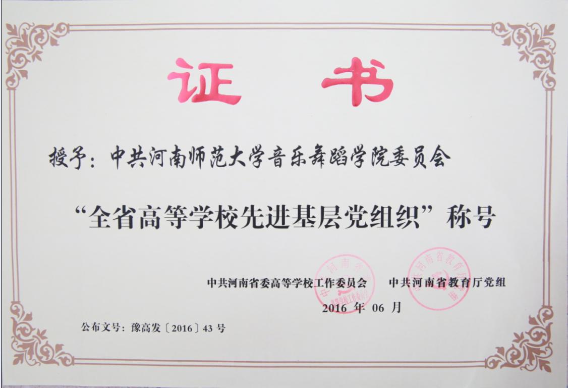 中共河南省委高等学校工作委员会、中共河南省教育厅党组共同授予中共河南师范大学音乐舞蹈学院委员会“全省高等学校先进基层党组织”称号。7月1日上午9点,我校在音乐厅召开“七一”表彰大会,并授予我院“全省高等学校先进基层党组织”称号,同时受表彰的还有2名校先进党支部、2名校优秀教工党员、1名校优秀党务工作者,2名校优秀学生党员。