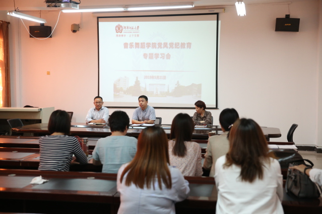 5月21日下午,音乐舞蹈学院党风党纪教育专题学习会在学院二楼会议室召开,院党委领导班子成员及教职工党员参加会议。院党委副书记蒋晋光主持会议。