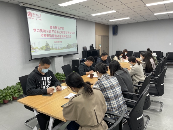 院党委书记侯帅指出,党的二十大闭幕之后,习近平总书记到陕西延安和我省安阳视察,让我们倍感振奋,深受鼓舞。他强调,要把学习贯彻习近平总书记带领新一届中央政治局常委瞻仰延安革命纪念地重要讲话、视察陕西延安和我省安阳重要讲话,与学习宣传贯彻党的二十大精神紧密结合起来,迅速掀起学习热潮,将学习成果转化为立德树人实效。要深刻把握传承中华优秀传统文化,坚定文化自信的重要要求,引导全院师生更好认识和认同中华文明,依托中华优秀传统音乐传承实验班,发挥专业优势,开展特色课程,让中华优秀传统文化在大学生心中生根发芽,更好弘扬和传播中华优秀传统文化。要坚定正确的政治方向,立足岗位、守好职责,牢记习近平总书记的嘱托,充分发扬延安精神和红旗渠精神,用实干诠释初心,教育引导广大青年学生进一步坚定历史自信,做有理想、敢担当、能吃苦、肯奋斗的新时代好青年。