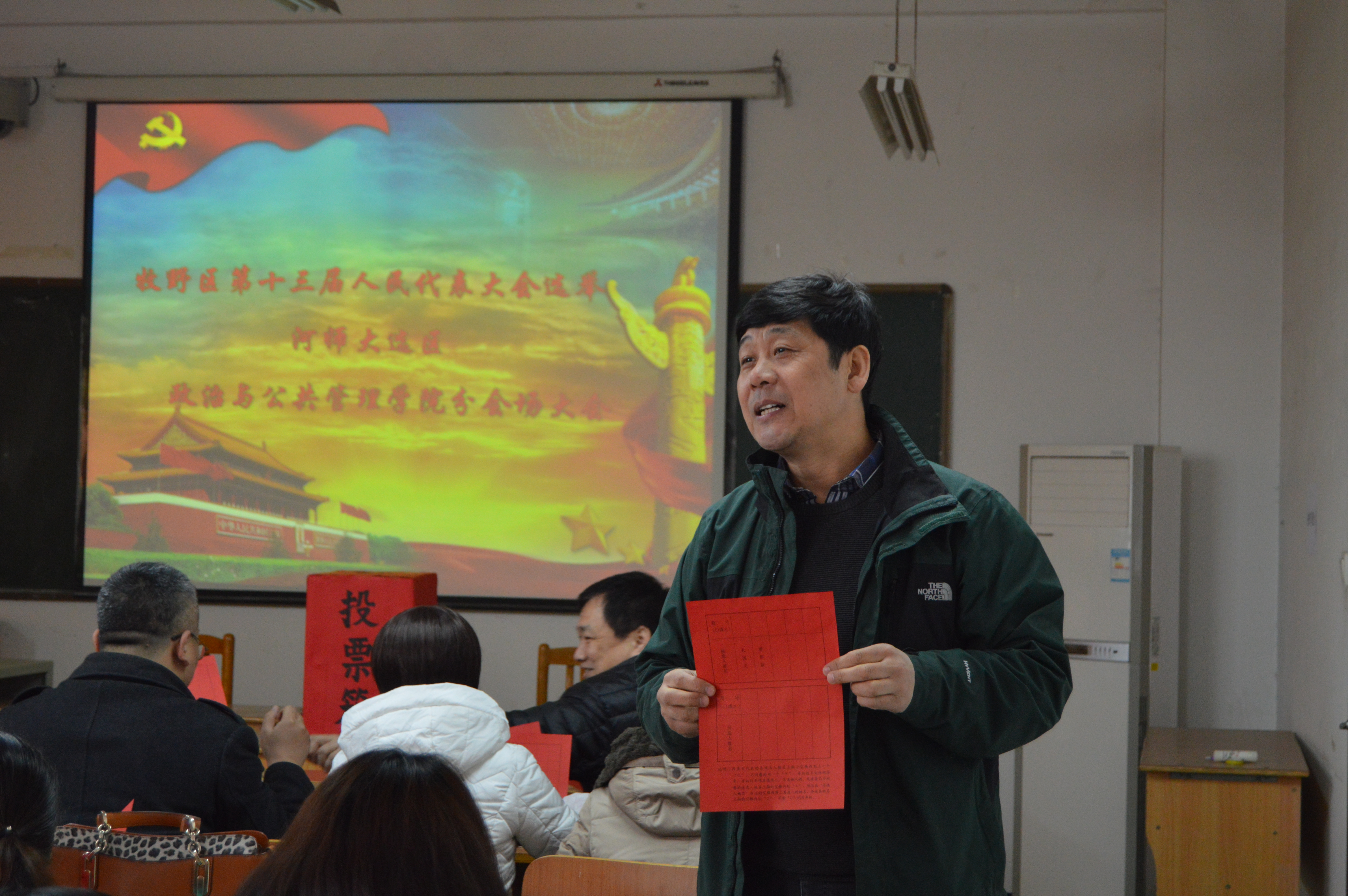 2月22日上午,牧野区第十三届人民代表大会选举河师大选区政治与公共管理学院分会场投票选举工作在政管楼217室圆满落下帷幕。学院符合选举条件的84名师生选民参与其中。学院党委书记杜灵来主持会议。