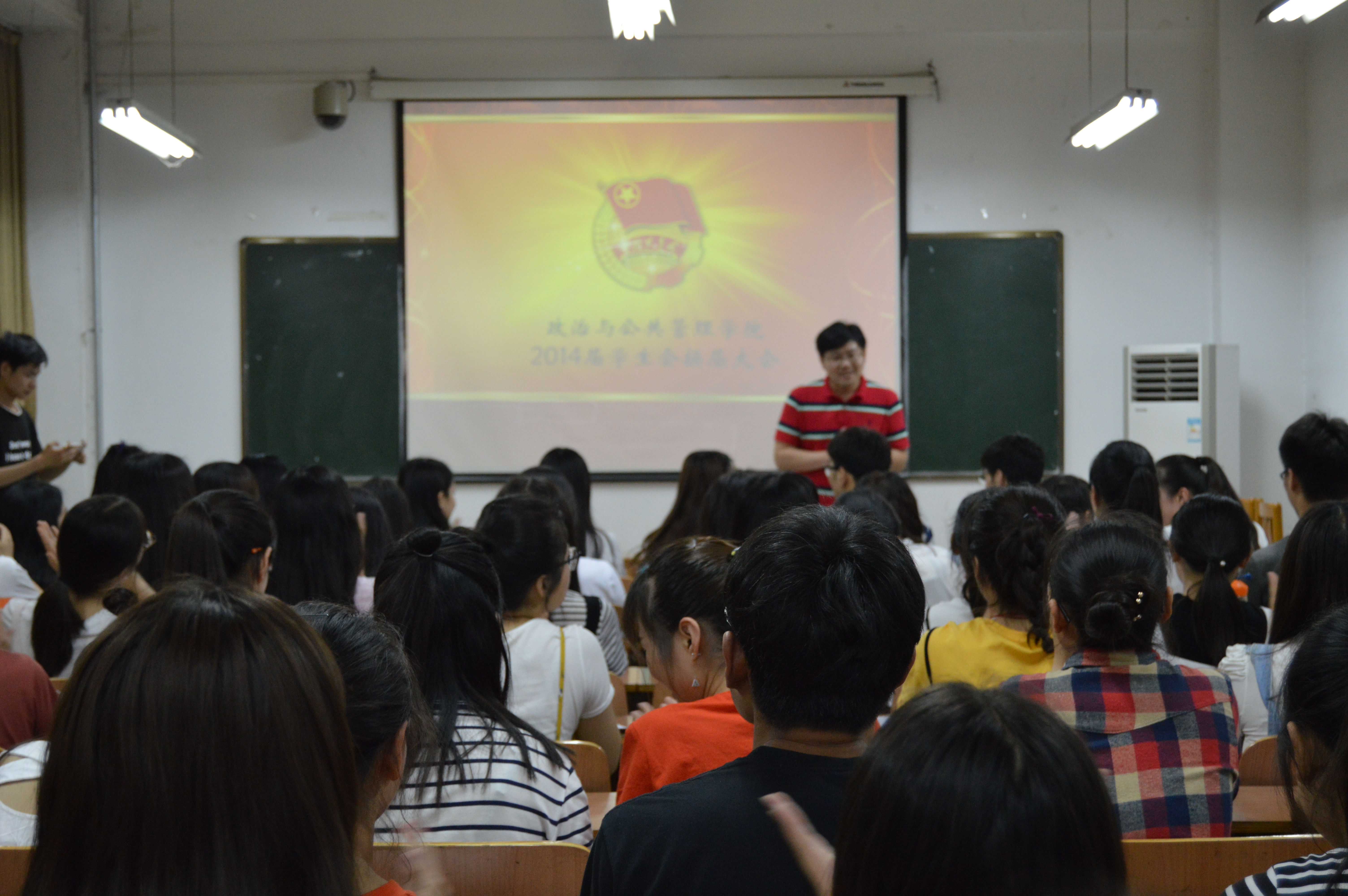 会上,2014级学生会主席宋潘婷向团学成员表示感谢,她回顾了团学这一年来获得的成绩,感慨自己的付出与所得,并总结工作经验与大家共享,同时勉励团学成员握好接力棒,保持热情,做好本职工作。随后,新一届学生会主席何帅表明会做好团队领头羊的决心,并对团学接下来的队伍建设、工作安排、活动质量及干部要求建设四个方面做出规划。号召大家要劲往一处使,增强凝聚力和向心力,对学生、团学和自己负责,在努力做好本职工作的同时提升自我素质,共同促进团学更好的发展。紧接着,何帅公布了新一届团学成员名单,大家一一站立介绍自己。最后,团委负责人张成功作总结发言,他对团学工作提出三点要求:一是团结,他提出要杜绝部分团学成员干部的“慵懒”现象,防微杜渐,所有人要拧成一股绳,一起向前冲。二是“亲民”,他针对部分团学干部脱离班级生活的情况,要求大家积极与本班学生沟通,坚持服务学生的原则。三是协调好学习与工作的关系,做到两不误。他对政管团学成员赋予厚望,希望大家能够坚持不懈,力争上游,不懈怠,不懒惰,更好地为学生服务。