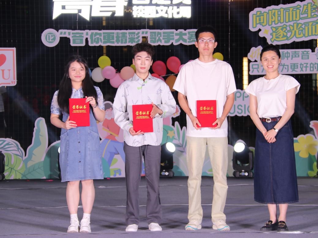 经过赛前层层选拔,十三位选手在决赛的舞台上各展所长,为观众带来了一场听觉盛宴。比赛在热烈欢快的开场舞中拉开帷幕。其中,一号选手邓得天演唱的《陪着你走》语调轻松,向观众传递出青春的美好与爱情的甜蜜;十二号选手金钰杰带来的《月半小夜曲》,将低沉的粤语与婉转悠扬的小提琴声交融,营造出夜晚静谧的氛围。演唱后,评委老师在肯定参赛选手在发声技巧和节奏韵律方面优秀表现的基础之上,对于其在歌曲的选择以及把控方面提出了完善建议。最后,比赛共评出一等奖三名、二等奖六名、三等奖四名,校团委副书记唐新为获奖选手颁奖并合影留念。除此以外,现场观众在中场游戏环节中积极互动,现场气氛活跃。