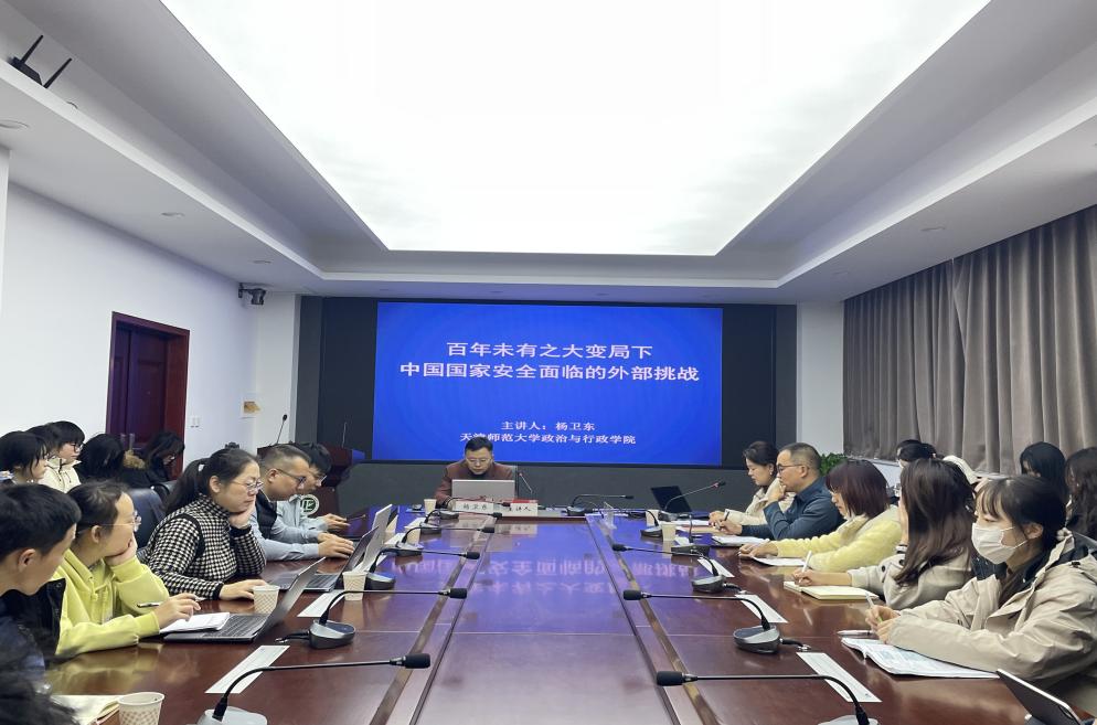12月9日上午,应政治与公共管理学院邀请,天津师范大学政治与行政学院杨卫东教授在学院517会议室作了题为《百年未有之变局下中国国家安全面临的挑战》的学术报告。学院相关专业教师、研究生、本科生参与。讲座由学院副院长原晶晶副教授主持。