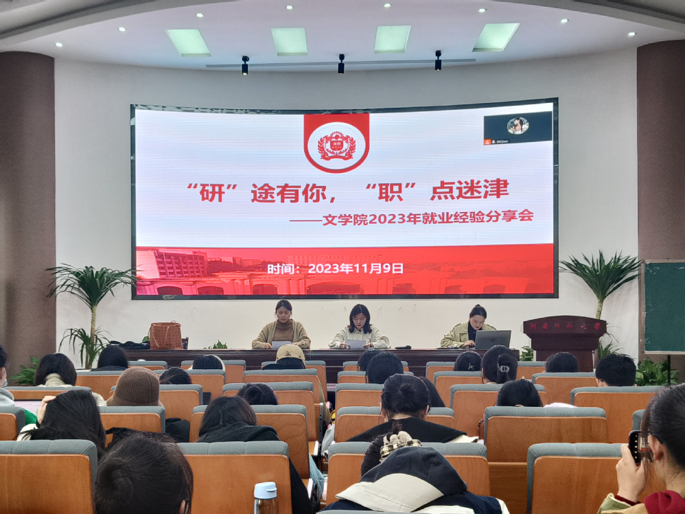为加强就业正向引导,做好就业育人朋辈帮扶工作,文学院于11月9日中午在一楼报告厅举办“‘研’途有你,‘职’点迷津”就业经验分享会。三位2023届优秀毕业生以及100余名2024届毕业生代表参加,本次会议由2024届毕业生辅导员桑庆芳主持。