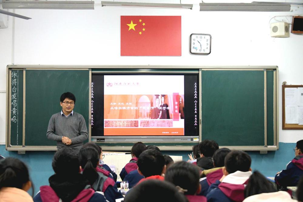 捐赠仪式后,文学院副教授褚俊海以“汉字与文化”为主题,面向高一年级开展科普讲座,讲授汉字、文化等相关知识和研究成果。