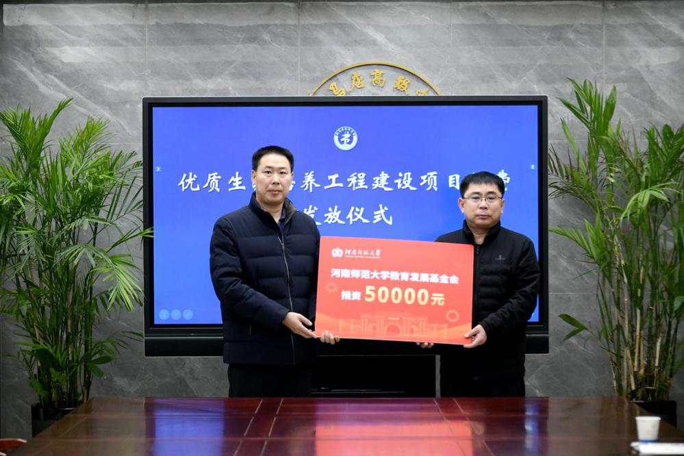 孙昌松首先对近年来驻马店高中的快速发展表示祝贺,详细介绍了河南师范大学的办学历史和特点,推介了报考河南师范大学的若干优势,并就优质生源培养工程建设项目内容做了说明。他强调,近三年驻马店高中向河南师范大学输送优质生源210多人,为了加强两校间的合作交流,积极探索构建互联互通、培养优质生源的长效机制,特向驻马店高级中学捐赠优质生源工程建设项目经费,更好地推进高校与中学的深度交流,打造未来有更广阔的合作前景。