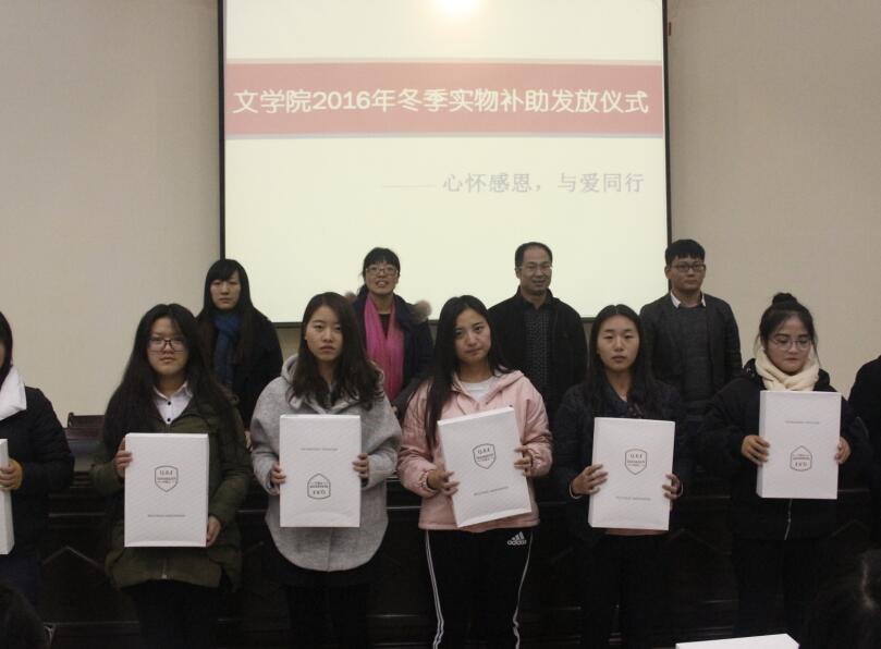 为保证2016级经济困难新生能够顺利度过即将到来的寒冬,11月14日晚,文学院在报告厅举办2016年“心怀感恩,与爱同行”冬季实物补助发放仪式。文学院党委副书记高飞,团委书记、2016级辅导员王秀杰,两位2016级兼职辅导员与全体受助新生参加了发放仪式。