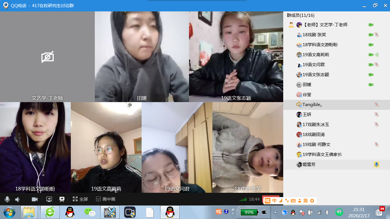不过,视频也存在一些问题,如有的同学网络不好,时常掉线,受QQ视频限制,只有部分同学有头像,其他人只有音频。不过这也没有影响交流。