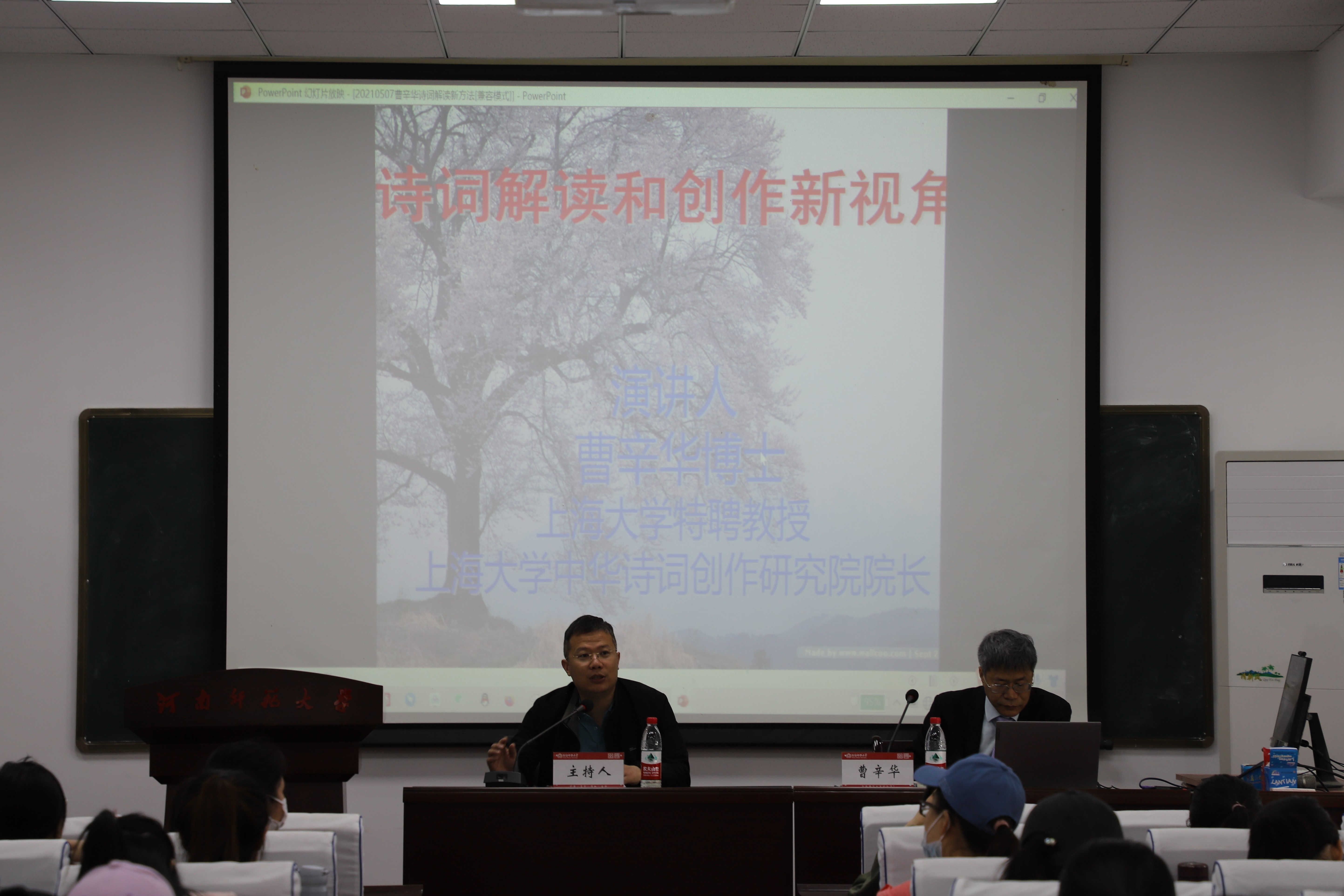 5月7日上午,文学院1993级校友、上海大学教授曹辛华应邀在崇文楼504室为学院师生作题为“诗词解读新方法”的讲座。讲座由学院副院长陈鹏主持,近百名学生参与学习。