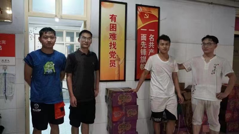 7月21日中午,党支部的男生们到校外买了20箱泡面、面包等物资,在雨下送到东区的宿舍,发给同学们。物资外面的包装纸箱早已被打湿,奔波回来的男生衣服上分不清是汗水还是雨水,湿漉漉的头发不断向下滴水,而站在“有困难找党员”的牌子前,他们脸上却是带着成就感的坚定。