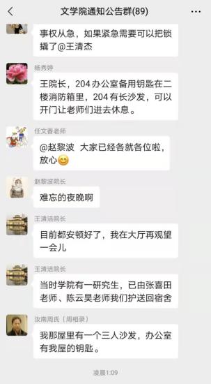 原本准备回寝室休息的党支部男生看到已经淹没楼下三层台阶的雨水,决定守在这里。他们组织同学建了一个群,把留校的学生和他们的家长都拉了进来,在断电断网时尽量第一时间向家里报平安。
