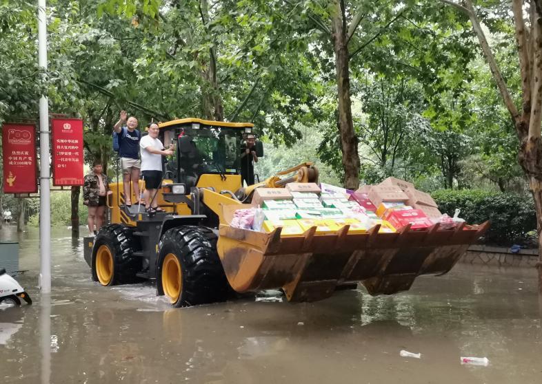 站在挖土机边缘运送300余箱物资驶向“家”里