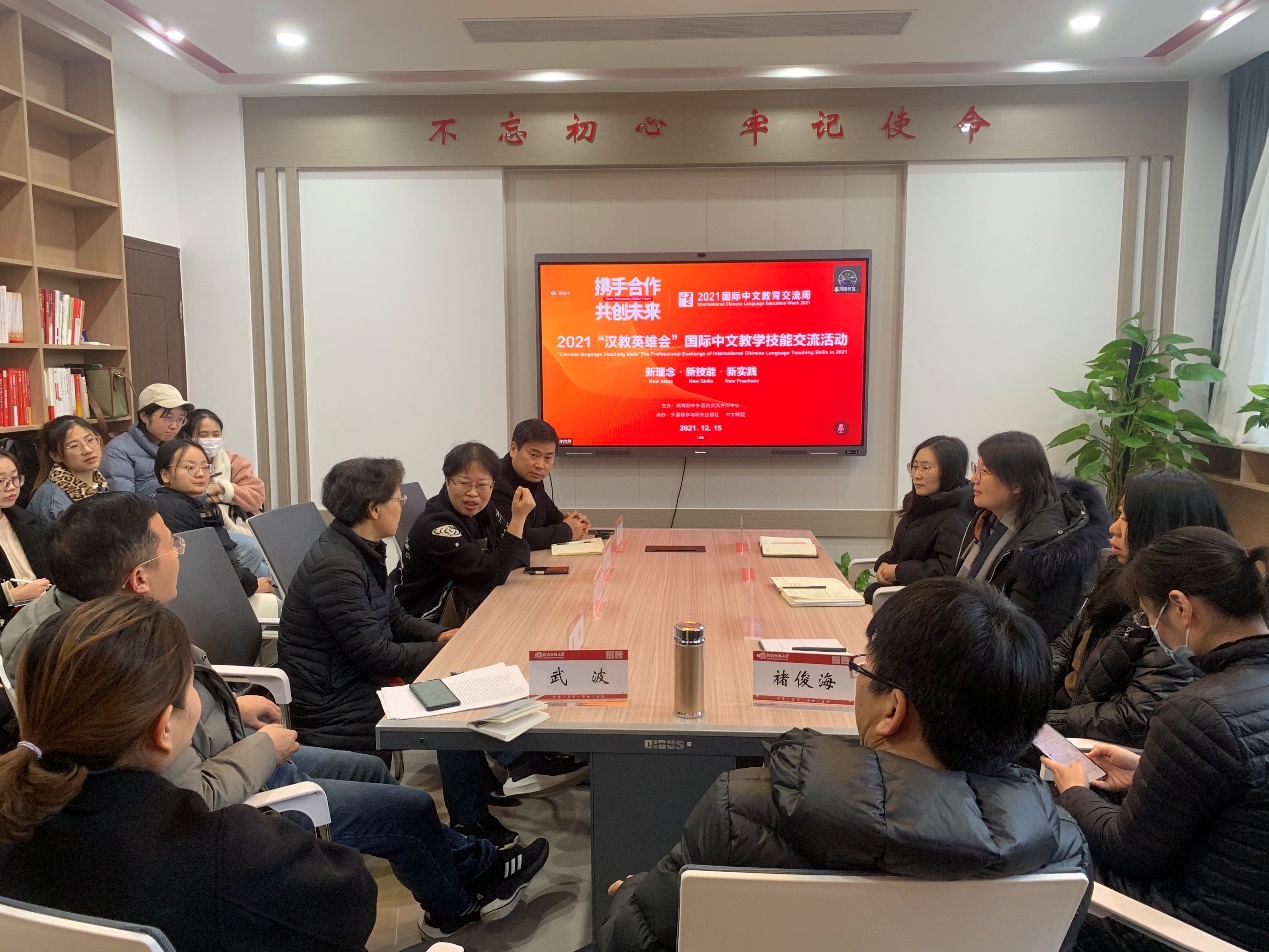 12月15日上午,我院组织汉语国际教育硕士观摩2021“汉教英雄会”国际中文教学技能线上交流活动。国际合作与交流处处长赵扬、萨戈达大学孔子学院院长陈运香、国际合作与交流处王素敬老师一行来我院开展工作调研指导,于文学院党建书屋召开交流会。文学院院长赵黎波,副院长王清杰、陈鹏以及连晓霞、褚俊海、张恒君、武波等负责汉语国际教育硕士培养工作的老师参加了教学交流活动。