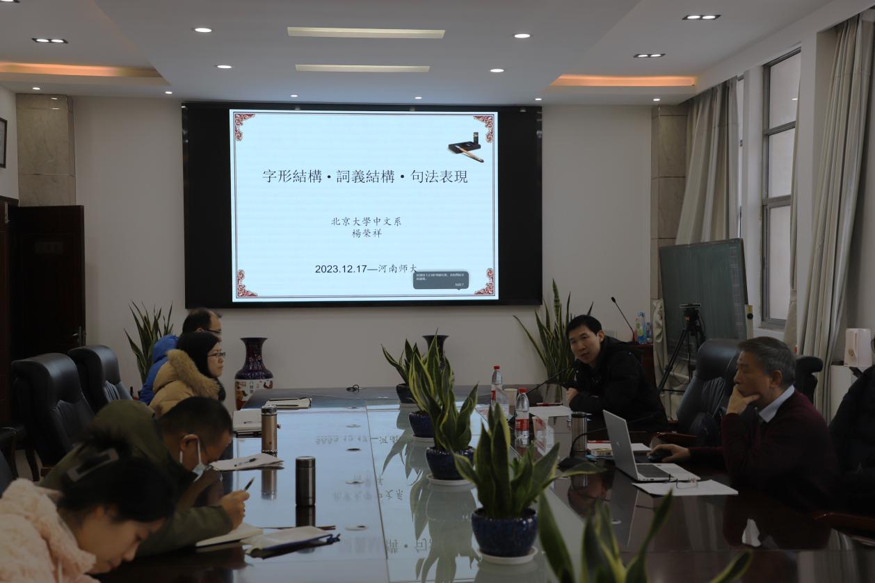 12月17日上午,北京大学杨荣祥教授应邀做客“卫风讲堂”,在崇文楼二楼会议室为文学院师生作题为“字形结构·词义结构·句法表现”的学术报告。讲座由学院副教授曹志国主持。