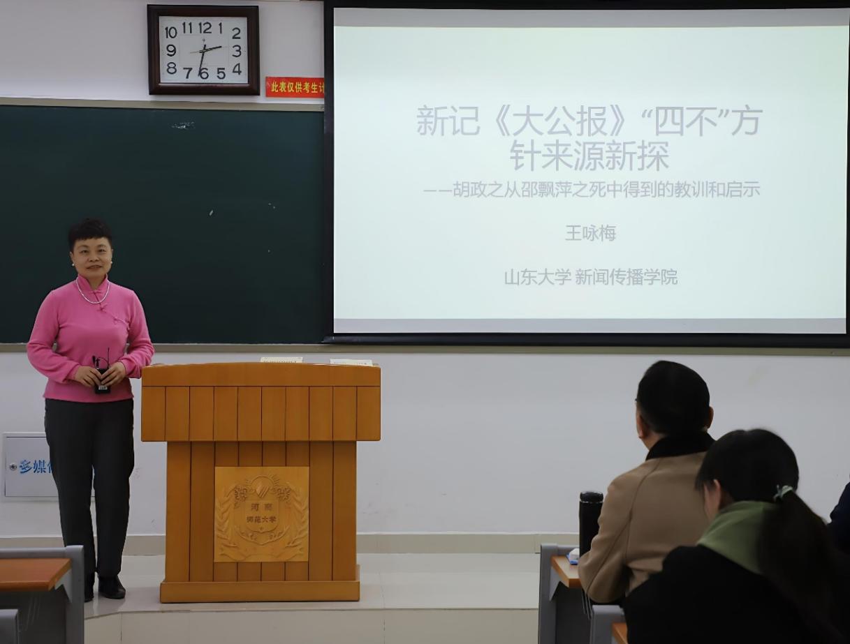 3月14日下午,山东大学王咏梅教授应邀做客“卫风讲堂”,在文昌楼113教室为文学院师生作题为“新记《大公报》‘四不'方针来源新探”的学术讲座。讲座由广播电视学学科带头人段勃教授主持,广播电视学专业师生参与学习。