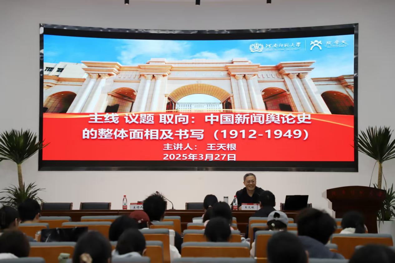 3月27日上午,安徽大学王天根教授应邀做客“卫风讲堂”,在崇文楼一楼报告厅为文学院师生作题为“主线 议题 取向:中国新闻舆论史的整体面相及书写”的专题讲座。讲座由广播电视学学科带头人段勃教授主持,四十余名师生参加学习。